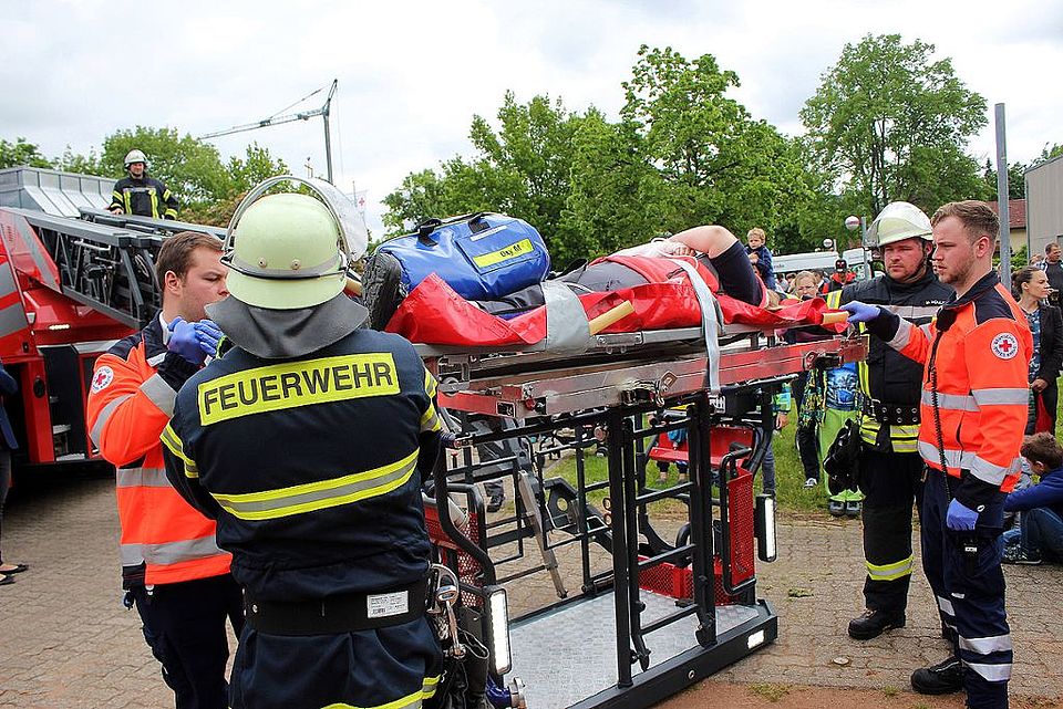 Dass die Bereitschaft des DRK mit der Freiwilligen Feuerwehr sehr gut zusammenarbeitet, ist weithin bekannt, am Sonntag wurde es nochmals bestätigt. Das gemeinsame Übungsszenario nahm an, dass eine verletzte Person vom Dach der Halle zu bergen ist, was die DRK-Kameraden ohne technische Hilfe nicht erledigen können, deshalb kam die Drehleiter zum Einsatz.